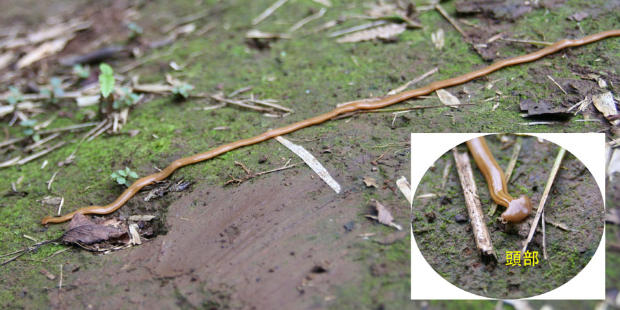 | 体長40センチは超えていた。当初は血を吸うヒルの仲間だと思ったので、写真を撮るために棒を使って草むらから林道に移した。その際に体長の三分の一くらいの所で切断していました。後で知ったのですが、この生物、体を二分しても両方とも再生するそうです。血を吸うヒルとは全く異なる種類で、もともと日本にいなかった外来種だそうです。ミミズやカタツムリ消化液で溶かして飲み込むそうです。日本種はクロコウガイビル 動画 |