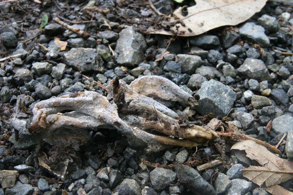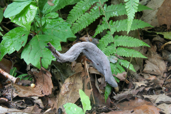 10センチほどの背丈、表面はビロード状というかカビに侵されているようにも見える。 毎年歩道脇に発生する。 先端は黒く細い