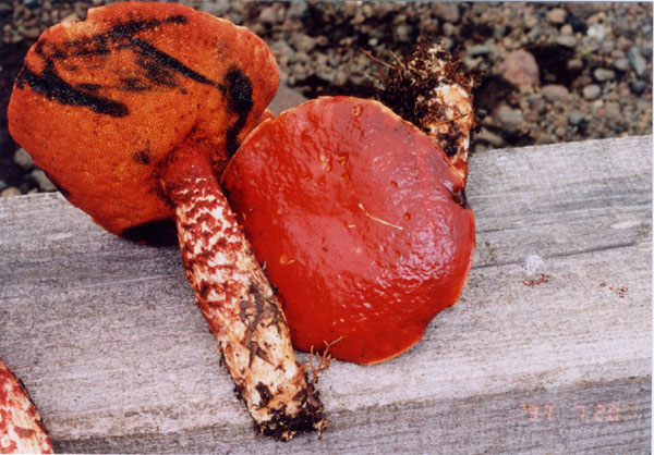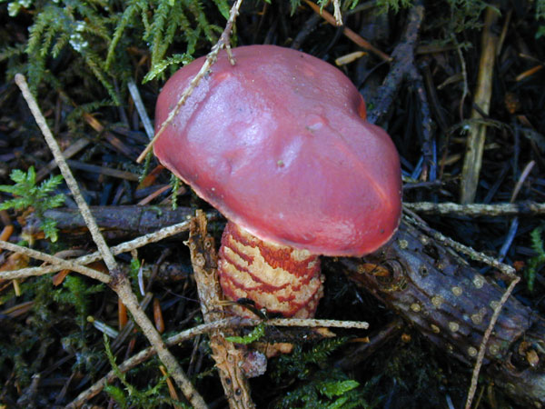 | 柄がささくれて現れる白と赤のコントラスが特徴。2001年以降このキノコに出会っていない。 この時期にこの標高の富士山に行かなくなったからかも? |