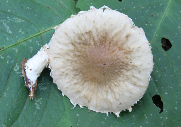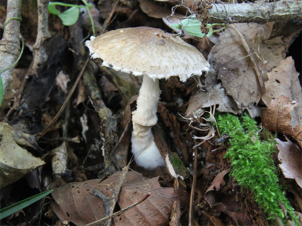 | つばは不鮮明だが名残りの白い綿状の繊維がフリル状に付着していた、径3〜4センチ 落ち枝沿いにその下から発生しているようだ。 |