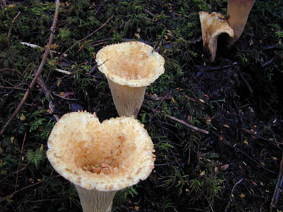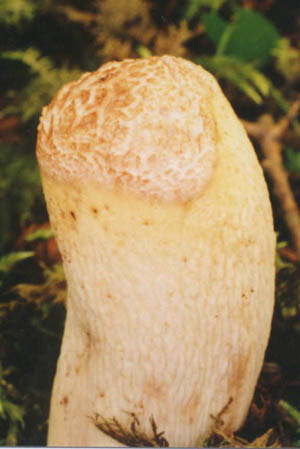 |  |  幼菌 7月30日 3号目付近 ソーセージの様に細長いキノコを見つけ家で図鑑で調べたが同定できず、翌週山で同じキノコが成長したのを見てウスタケと同定できた。 |
