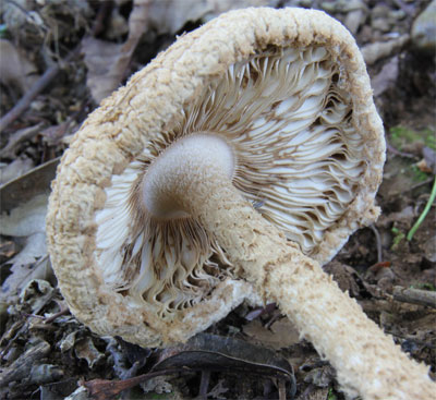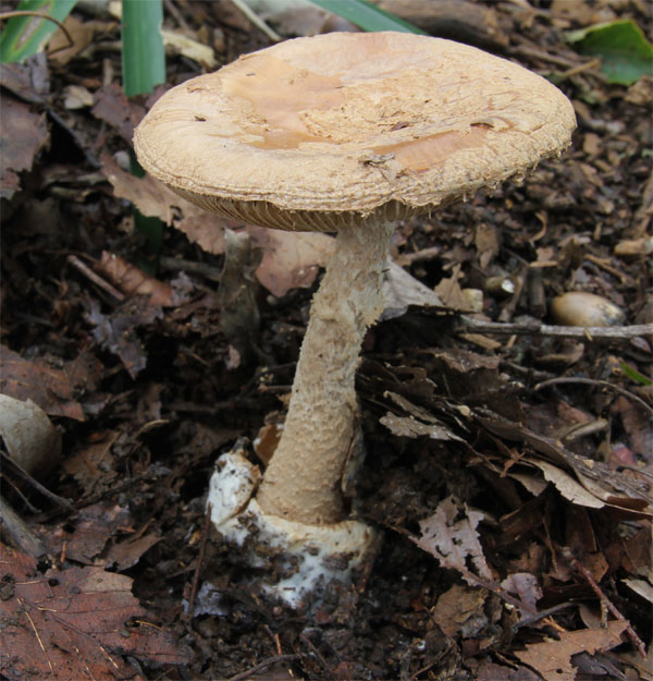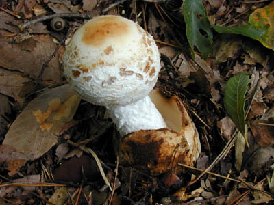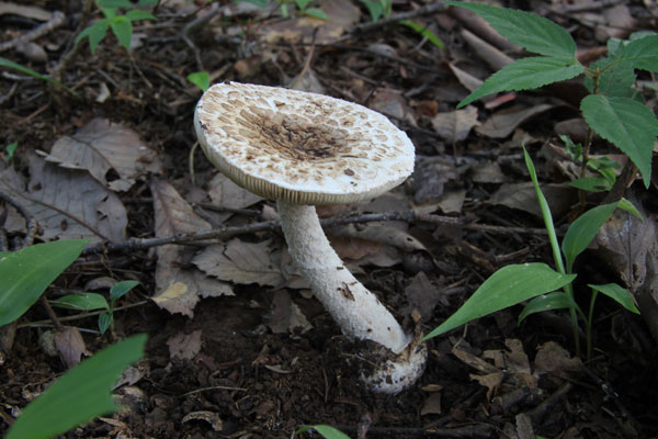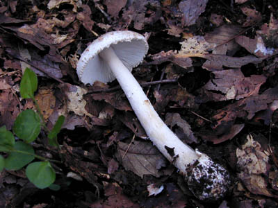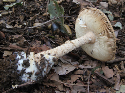 | どこでも見られる猛毒キノコ。 つぼの破片が傘に多く付着して少しピンクかかった模様がある。 | |