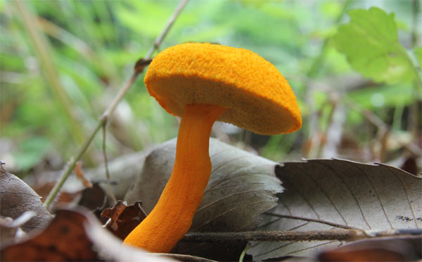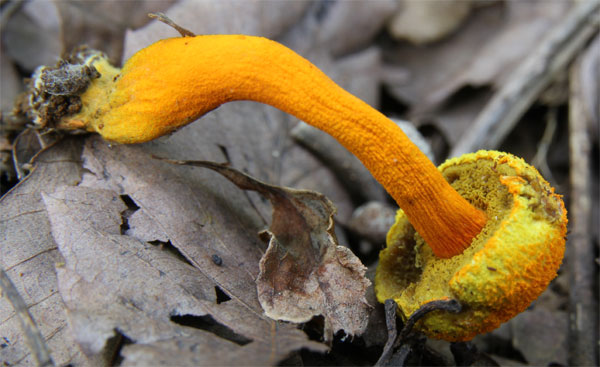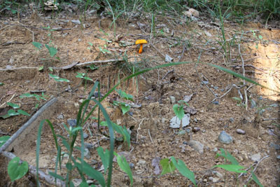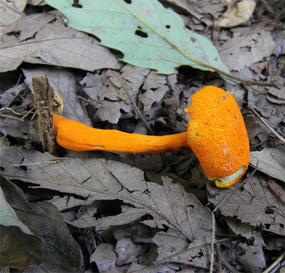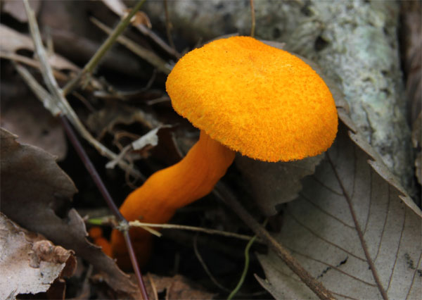 | 傘や柄がやや粉状で鮮やかやオレンジ色のきのこ この丘陵を15、6年歩いていて初め出会えて嬉しかったのだが、個体の状態と発生していた場所が良くなかった?? | |