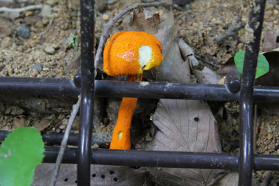 | 鉄格子の向こうのきのこ | 良い個体を見つけたが水道局管理用地の柵の中。 柵の隙間からの撮影した ちっちゃ! きのこ撮影にも望遠レンズが必要?? |