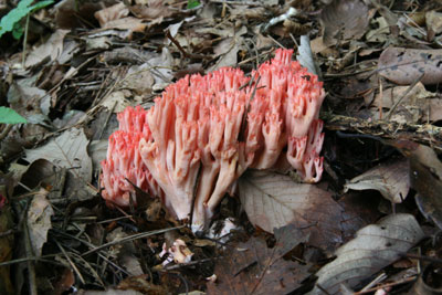 広葉樹林の山の斜面に輪郭を作り群生していた。食用のホウキタケに有るような大きな基部は無い。 毒キノコ