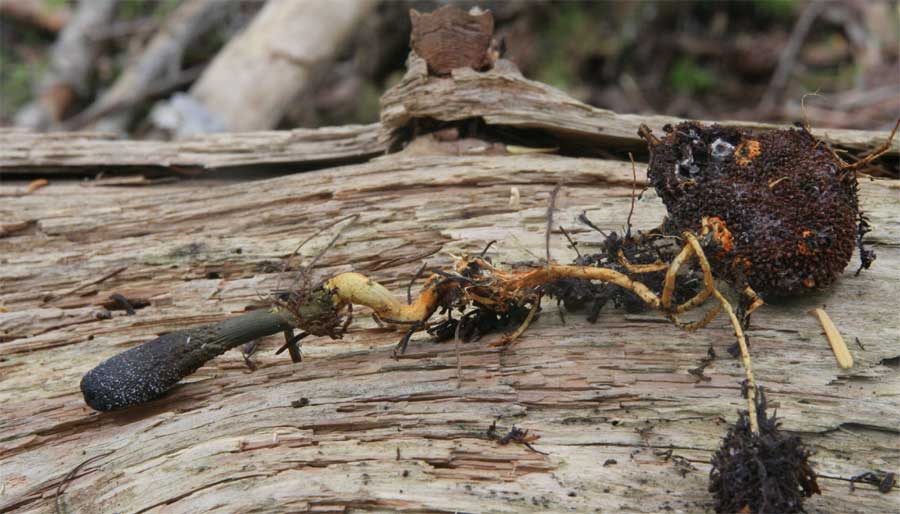 菌核の表面から細い菌糸体がハナヤスリタケに伸びている。このツチダンゴには褐色の粒状の突起がある。