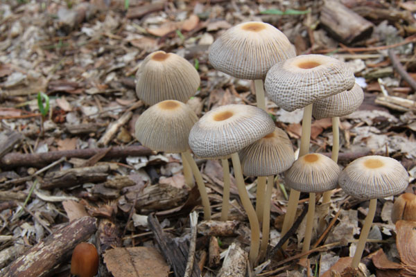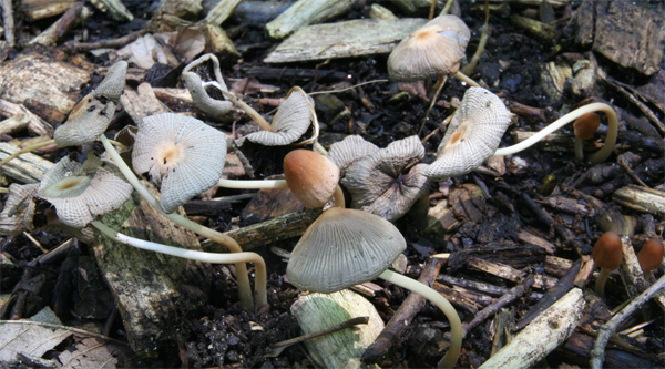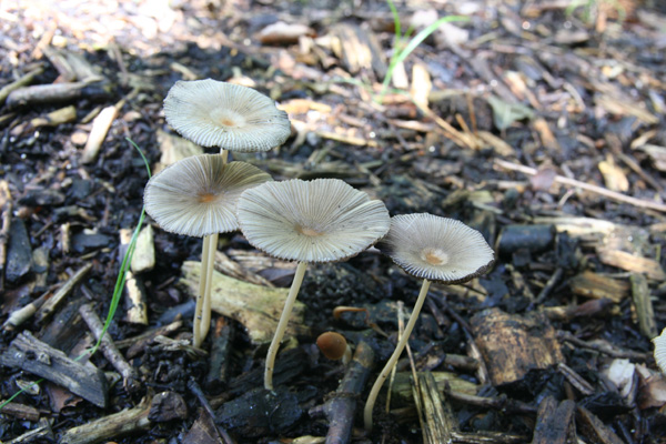 | 傘は全体に灰色で中央部は黄褐色で、下から覗くと光が入り中心部が黄色く輝く。中心部より長い溝線が伸びる。 ウッドチップ場でもその層が薄い所に発生する。 |