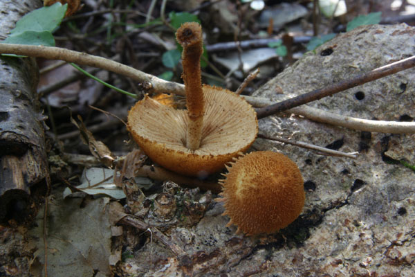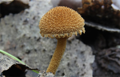 傘は針状の鱗片に覆われている。ヒメスギタケは針葉樹ではなく広葉樹に発生します。