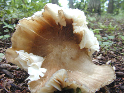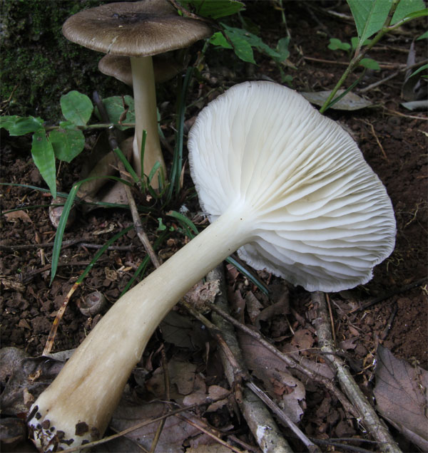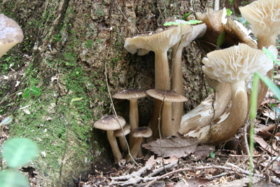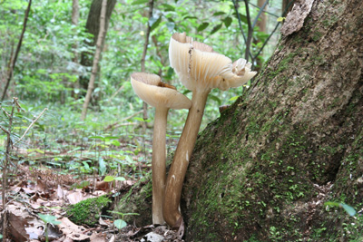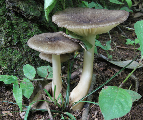| 時に15センチを超える大型菌となるので、梅雨時の雨を吸い込み過ぎて、倒れている個体をよく見る。広葉樹の根元で春から夏にかけてよく見る、5-6センチの灰色の傘のキノコ。当地ではコノナラの木の根元の発生が多い。毒の可能性あり。 | |