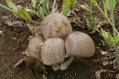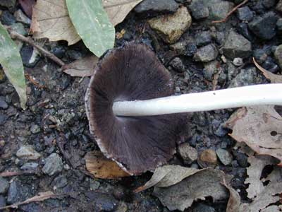 一夜の命のキノコ、 実際にはもう少し生きが長いが、最後には、真っ黒の液体になっていまう。傘の上には土が付着しているが、アスファルトのわずかな隙間からでも発生することがあるそうです。 |