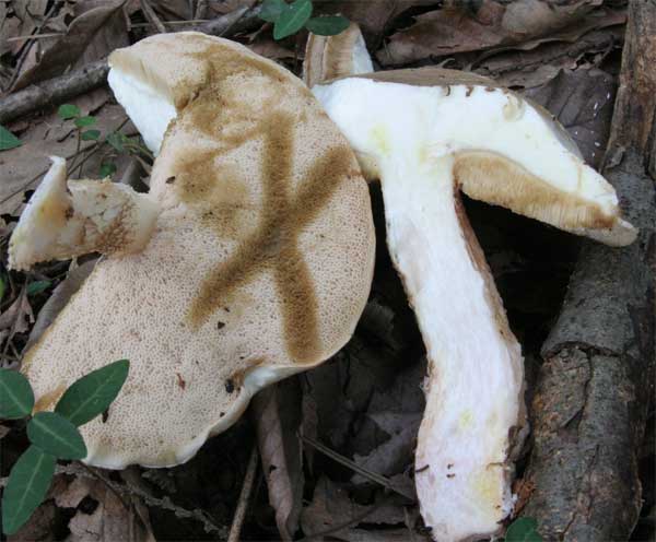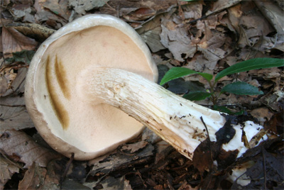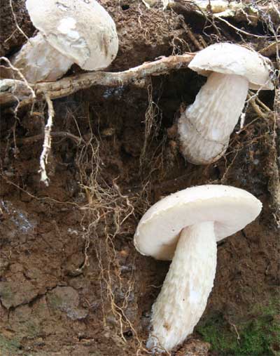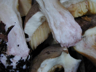 | 柄の網目は著しく隆起する。孔l口は傷つくと褐変 | 管孔は白から淡紅色 肉は白 |