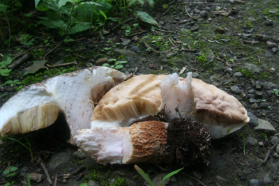 | 毎年同じ場所に現れる。 しかも、この山のこの斜面のこの場所に毎年発生する、不思議だ、面白い。 きっとこの場所が持っている条件がないと生きていけないのだ、この場所を大切にしてあげよう。小川の側など少し湿気のある場所を好むようだ。2日程でドロドロに解けてしまうものが多い他のイグチに比べ持ちが良い。このキノコの酸っぱさに含まれる物質が虫やカビから守っているのだろうか? | |