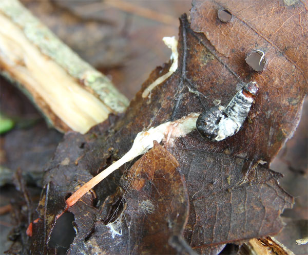 枯葉の隙間の一センチ程の蛾の幼虫から発生