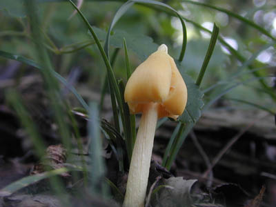 7月5日 このキノコの側には必ず、龍のひげのような細長い葉の植物がある。 共生関係にあるのか? それとも発生環境が似ているだけなのか? |