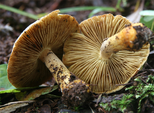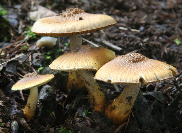 傘は明黄褐色で表皮は放射状に裂ける、中央の周囲に褐色の繊維を有する