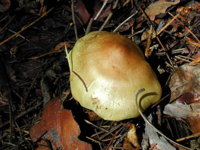 日当たりのよい赤松林で見つけた。シモコシ(まだ見たことが無い)に似ているらしい。ひだはレモン色。ごった煮で食べたので、ほろ苦いらしいが、確認できなかった。