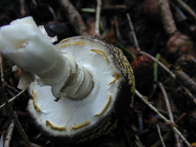 | この日の富士山には新たに発生したと思われるキノコは非常に少なく、このキノコも一週間は乾いた状態で存在していたと思われる。柄は乾燥し、ささくれ、傘の付着物もかなり失われている個体と思われる。図鑑ではブナ ミズナラの林に発生し、柄は薄黄色とあるが、針葉樹林帯に発生している事と柄が黄色を帯びないので ?マークを付けた。富士山ではよく見る。 | |