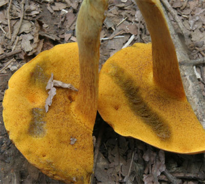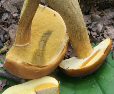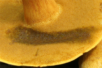 | 指で擦ると菌糸で塞がれている孔口がオレンジ色になる。 上部の網目明瞭 | 肉はややくすんだ黄色 |