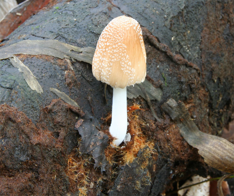 傘には粒状の鱗片をつける、基部の周辺にはオレンジ色のオゾニウム(菌糸マット)がある。