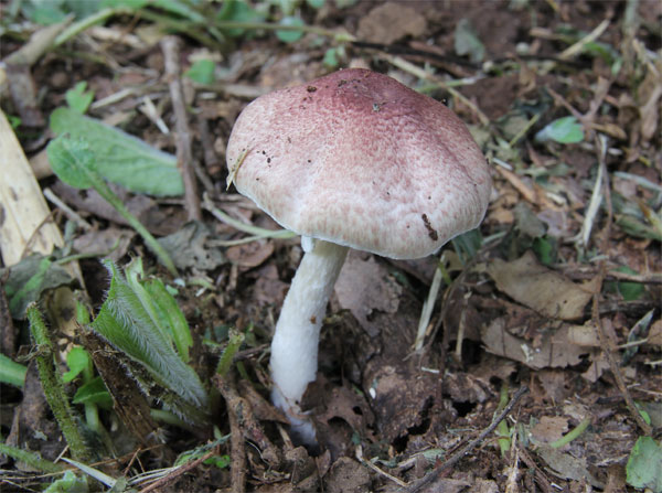 | 傘は径5センチ程 白地に赤紫色の細かい鱗片を付着し中央部では密集 |