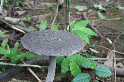 | 7月末と同じ場所に10個くらいの個体が発生していた。 発生場所をよく観察すると、エゴの木の根と関係がありそうだ。 この山には数え切れないほどのエゴの木があるが、この3畳ほどの場所2箇所でしか発生を確認していない。 似たキノコに大型のハイカグラテングタケがある。 |