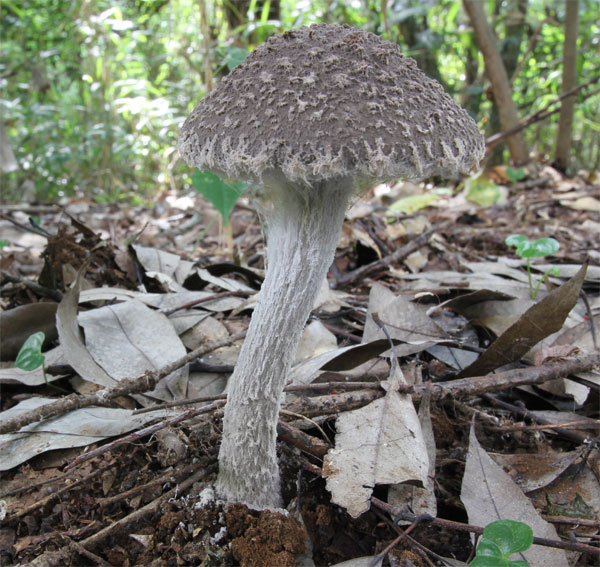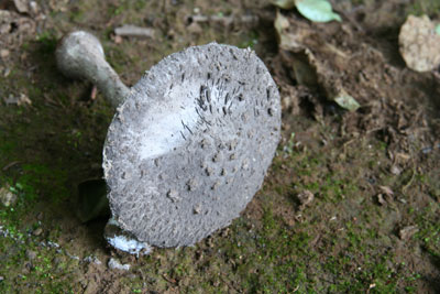 | 灰色の粉に覆われているため目立たない、中型のキノコ | ひだは白でやや疎、柄は灰色の粉が縦に走り、つば無し。 ひだの周囲には白色の綿屑状の物質が付着する。 |