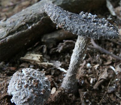| 全体に角錐状のいぼあり | 幼菌時すでに灰色の粉に覆われている。 |