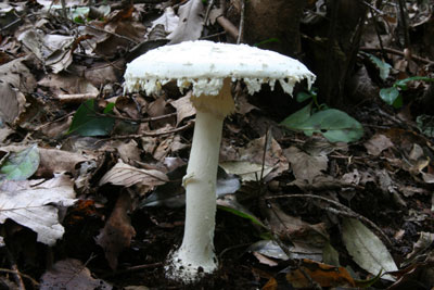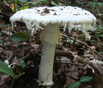 | 当地では夏から秋まで極普通に見ることができる。 鮮やかな白さが森の中では特に目立つ。 | |