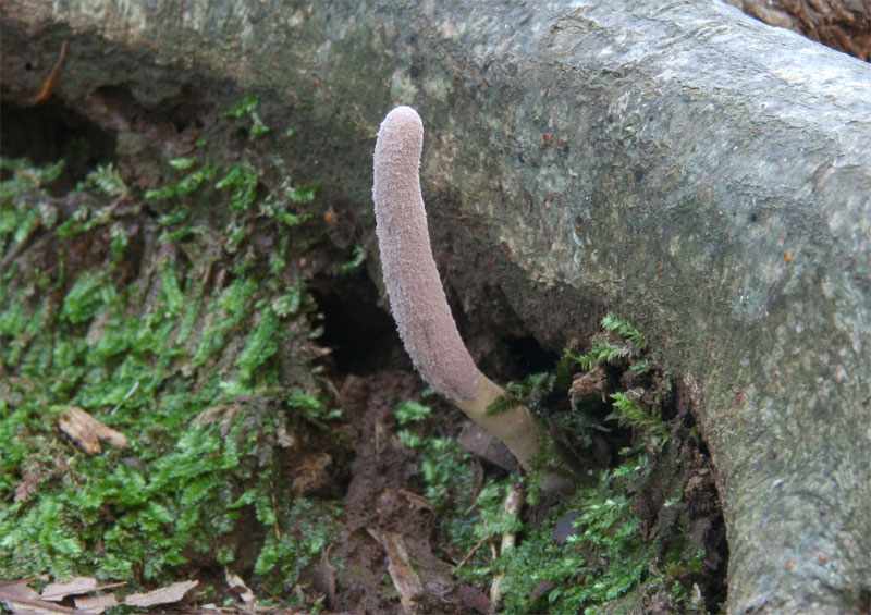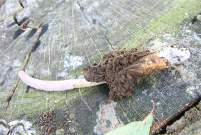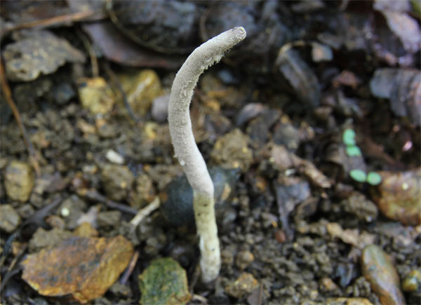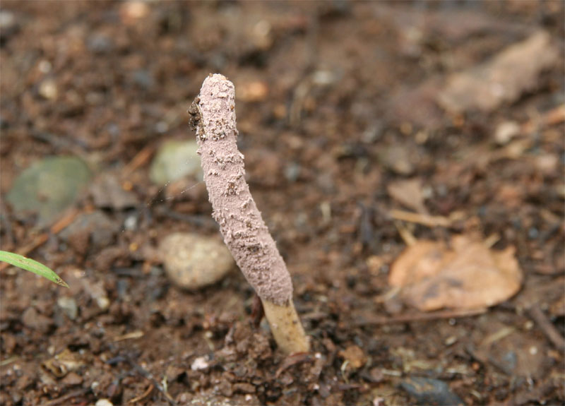 | 丈は5-6センチ程の薄紫色のキノコで、揺らすと薄紫色の胞子が飛びます。以前から昆虫に寄生するキノコを見てみたいと思っていましたが、なかなかそのチャンスに出会えませんでしたが、この日はこの場所以外でもクモタケを発見しました。梅雨時のこの時期に歩けば結構簡単に発見できるキノコのようです。 | |