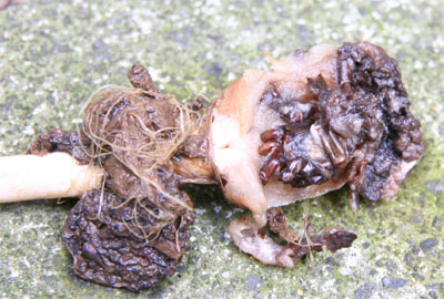 | 柄より太くなっています。 中のクモを薄い菌糸の膜で覆っています。 | クモの足が確認できます。ジグモに似ていますが、キシノウエトタテグモだそうです。個体を水洗いした事と手先が不器用なため、中のクモ様がグチャグチャになり分かりづらくなってしまいました(^o^) |