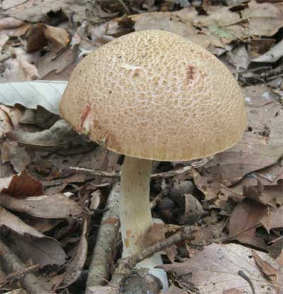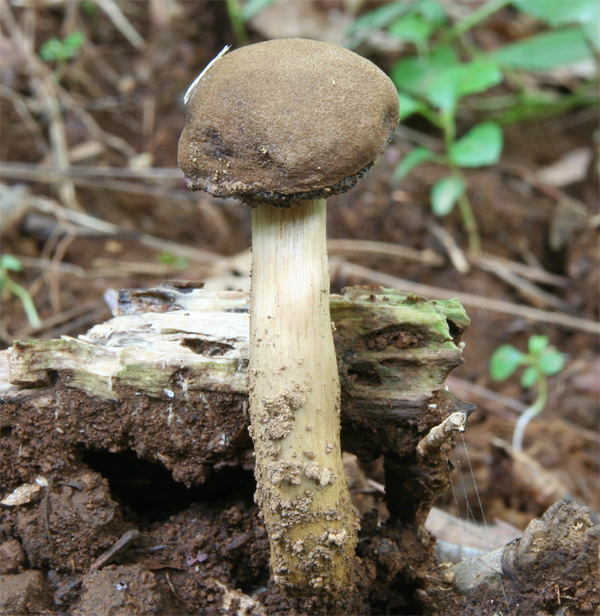 | 傘の色は褐色〜黄褐色、傘の表面はざらつき、褐色の粒上模様あり。 | |