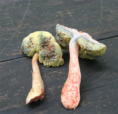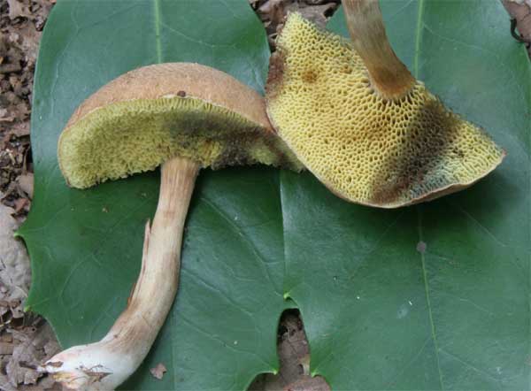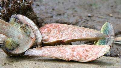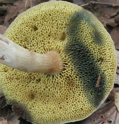 | 傘の肉は空気に触れると青変、柄は空気に触れ赤変後黒変 管孔は湾生 | 孔口を傷つけると青変、柄の基部には白色の菌糸塊 |