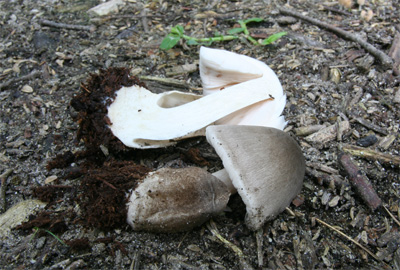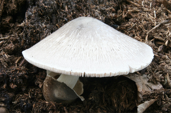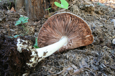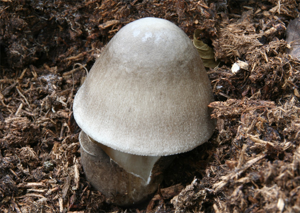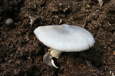 | 大型のキノコが堆肥の上に発生していた、すぐに根本を確認した、やっぱりそうだ。 初めてみるフクロタケ属のキノコに感謝感激雨霰。 | |