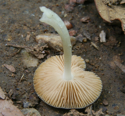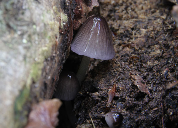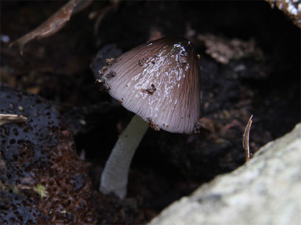 | コナラの倒木上に発生していた。小型の傘は淡灰褐色で中央部から紫黒色の粘性の脈状のしわが周辺に伸びる。 | ひだは成熟するとさび色 柄は白 |