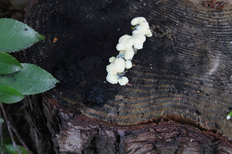赤松の新しい切り株上に発生していた。 左の黒いのが成菌、中央の白いのが変形体(未成熟菌)??