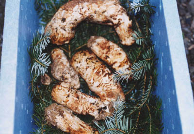 | 98年9月12日 この年は富士山て゛はマツタケの当り年だった。 シロに着くと何も頭を出していないのを確認し、地面の上から手でやさしく押しながら地中にあるマツタケを探してみる、野郎3人でニコニコしながら地面を押し続ける。 しばらくして 「あったー」の声、2センチくらい掘ってみると頭が見えてきた。地中のマツタケの感触を覚えると、次々と掘り当てた。他の友人も1メートルほど離れた場所で掘り当てた。写真を撮る準備をしていると、近くを中年の夫婦が通り声を掛けてきた 「袋にいっぱい入ってるようだけど、採れたか」。 「 いや 全然 お弁当ですよ。」 すぐにマツタケを踏みつけないぎりぎりの位置に座りこんでコンビニで買った弁当を取出し食べ始め平静を装った。かなりこの辺を見まわしている様子、もしかして以前にこのシロで採ったことがあるのか? いろいろ推測してしまう。しばらくし近くをウロウロしてから彼らは去って行った。 写真撮影終了後に掘り出してみると、全部で6本になった豊作だ。 |