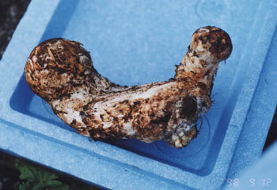| 一つの柄の両端に傘の形を形成している、地中では横向きに寝ていたが地上に出る頃には通常分離するのか?それとも束生の形で、頭を出すのか? |