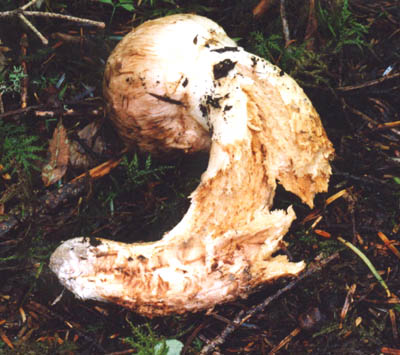 | 地上に出る直前に腐ってしまったマツタケ。 このシロが平坦すぎて他のシロと比較して水はけが悪いのか? いろいろ考えて見たが、一つしかシロがないので、データ不足。 この年マツタケは不作で、このようなシロが多かったと後で聞いた。 | 傘となる頭の部分も割いてみた。柄ほどには腐っていないが、食べる気は起こらない。 | ||||
