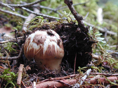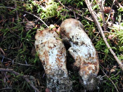 | 8月14日2002年 去年獲得したシロの場所の確認とヤマドリタケモドキを求めて、今年初めて、富士山に出かけた。 出発が遅れたため渋滞にはまり、八王子インターで中央高速に入るのに、いつもの倍かかり、スバルラインは、乗用車規制中となっていたので、林道の2合目辺りに車を停めて、歩いて5合目まで行くことになった、歩き始めたのは昼近く暑かったのと久々の山歩きとで、ヘトヘトでした。この日の山は非常に乾いていた、キノコはほとんど無い、あっても乾燥キノコばかりだ。見つけたキノコは、干乾びたショウゲンジ2個、腐ったヤマドリタケモドキ1個、食べ頃のドクヤマドリ1個、アンズタケとフジウスタケが少々にマツタケ一本でした。地元の人の話では、7月の終りころキノコは沢山発生したそうですがその後雨が降らず、だめな状態が続いてるそうです。9月に入ったらお湿りの状態を確認して、3回はマツ狙いで出かけるつもりです。とりあえず、6番目のシロ。 ラッキーでした。 | |
