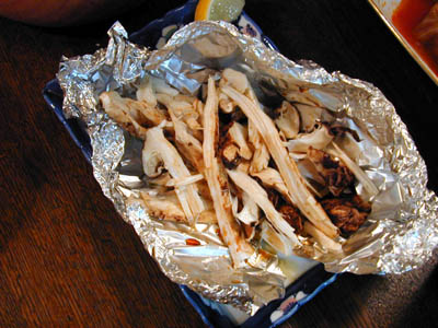 | すき焼きです。 ホウキタケの柄のスライスを入れてみました、マツタケの香りがホウキにも移りシャキシャキ感のある偽マツタケがボリュームを増やし、味もグッドです。 | ホイル焼きです。 美味しいのですが、だんだんマツタケの香りが鼻についてきます。 |