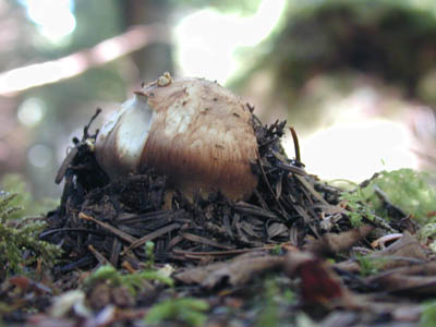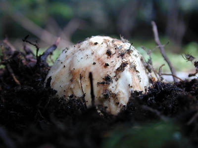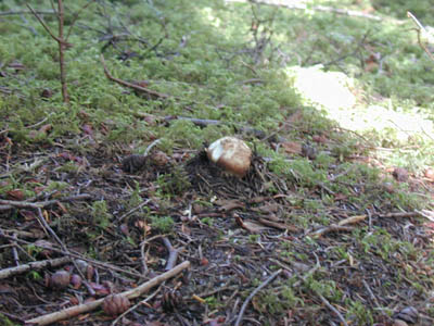 | 先週3本採ったシロで、辺りを手で押し地下のマツタケの発生は今年は無いと確信していたのですが・・・・。このマツタケを掘り出してみると、地下には白い菌糸がたっぷり在り、小さな子実体と思われるものもできかけていた。来週は行けないので、これらが成長しないことを願う。このシロにおいて、今年は3週に渡り6本目となり98年の記録と並びました。 | こんな物出てました。 開いているマツタケは、6年ぶりです。 6年前のものより小ぶりです。 7番目のシロとなります。 |