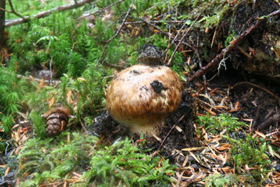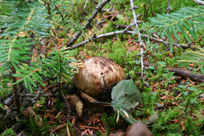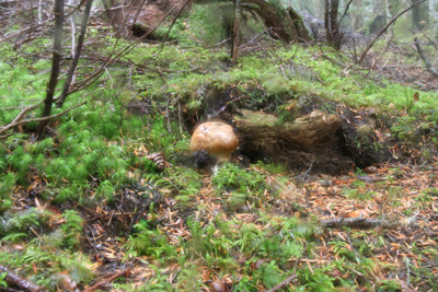| この日の富士山では3合目から上では霧雨が降っていて虹が出たりしていてとても良い雰囲気ではあった。しかし森に入ってみると先々週よりは雑キノコは出ていたが、非常に少ない。 本日もマツタケの発生は確認できませんでしたが、ホンシメジ2株(あまり良い状態ではないが)やヤマドリタケ1本、ハナイグチ10本と夕食のおかずに色を添えることができました。東京でも朝晩は少し涼しく感じる日もでてきたが、まだまだ日中は暑く、少しお湿りが有ると真夏のキノコが元気に現れる状態です。台風9号の通過で沢山のシラビソが倒れ、落ち枝が堆積し環境がずいぶん変わってしまったシロもあった。台風などで大風が吹くと樹木の根が刺激され菌糸の生育を助けると聞いた事があるが、まだその様な喜ばしい状況ではないが今後に期待したい。 9月1日よりは少し改善した二回目の富士山でのきのこ狩りとなった。 | |