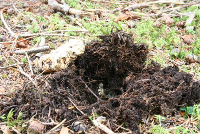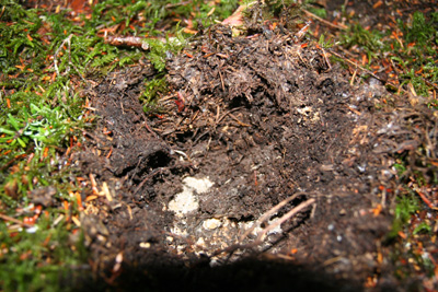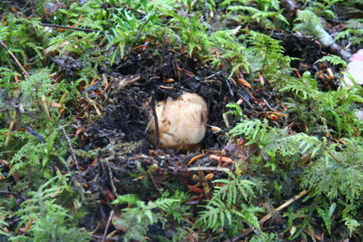 | 地面が盛り上がっているのに気づいた。しかし友人がこちらに向かって数人の人が近づいてくるのに気づいた(耳の悪いオレに聞こえなかったが)。 この程度の盛り上がりでは気づかれないと確信したので、その場を一度離れた。 | しばらくして戻り、掘ってみると小さいが5本育っている。3本残して埋めておきました。 腐ってしまうか、それとも成長すのか? シロ(96)にて |
