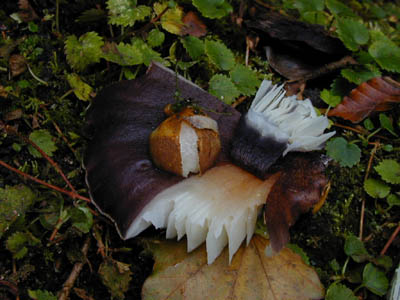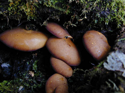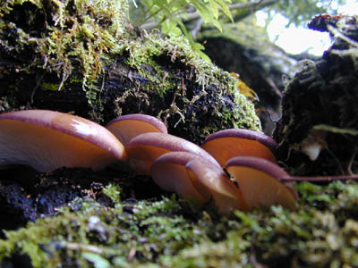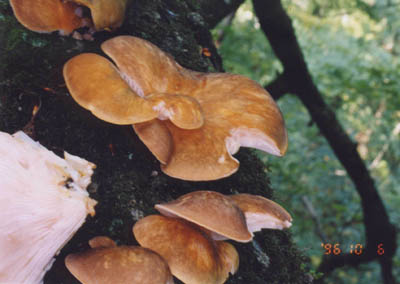 | 晩秋のころブナの倒木などに発生する。上の写真の個体は、紫色が濃い。採ると多量の水分を含んでいる場合が多いので、手で搾って持ち帰った。 同じ倒木にツキヨタケが混じっていることがあるので、要注意。 傘の表面の皮が剥けやすいからムキタケと言うのだろうと聞いたが、ヒラタケもツキヨタケも表皮は剥ける。 けんちん汁に入れ煮込むと表皮が自然に剥がれて、プルプルのプリンのようになる。この事からムキタケと呼ぶのでか? 個人的には、この触感は好きだ。 | |
