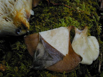 | ムキタケの皮むき 左上ツキヨタケ | 下はツキヨタケ皮むき 上の小さいのがムキタケ |
