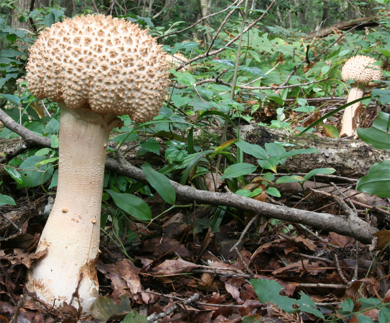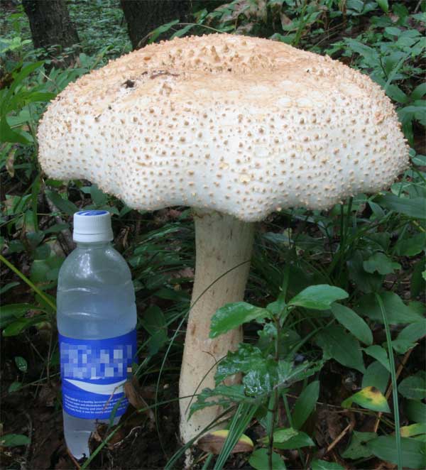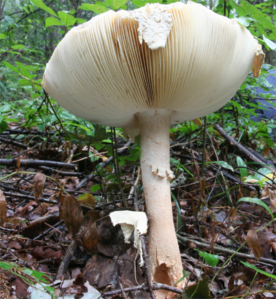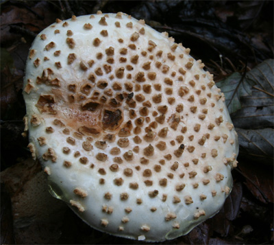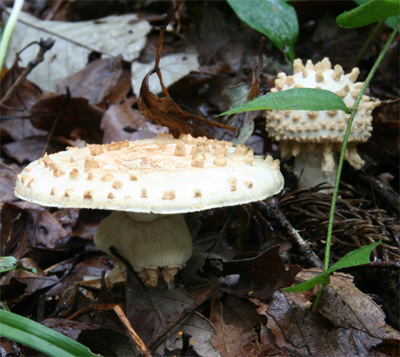 | シロオニタケの大きいものはよく見るが、このクリーム色を帯びたキノコ、発見当時には名前が分からなかった。 この場所には10個ほどの発生を確認した。 | |