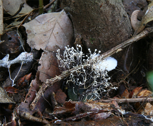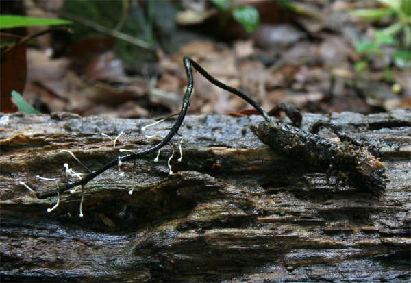 | 成虫に発生したものより黒い針金状の主柄が長いのは、 おそらく幼虫は成虫にくらべ寄生された時の場所が地下やや深いためと思われる。 |