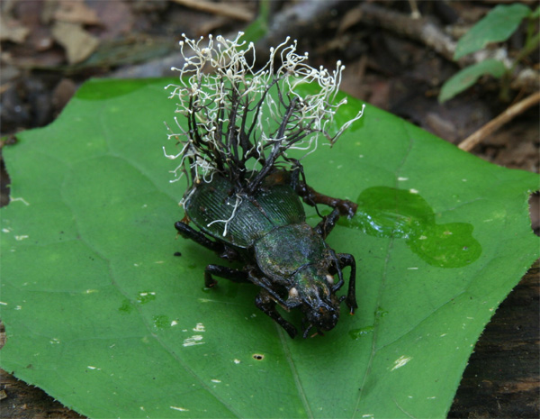 | ただのオサムシタケだと思い、一枚だけカメラに収め家でパソコンで見てみると、寄主がどうもオサムシではないようだ。 クワガタかな??? |