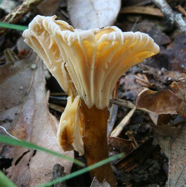 傘は全体が汚黄色で幼菌時中心部が焼け焦げた様