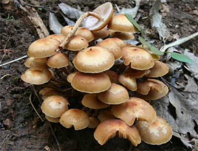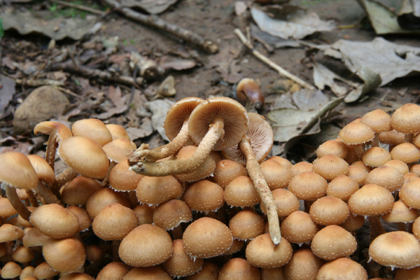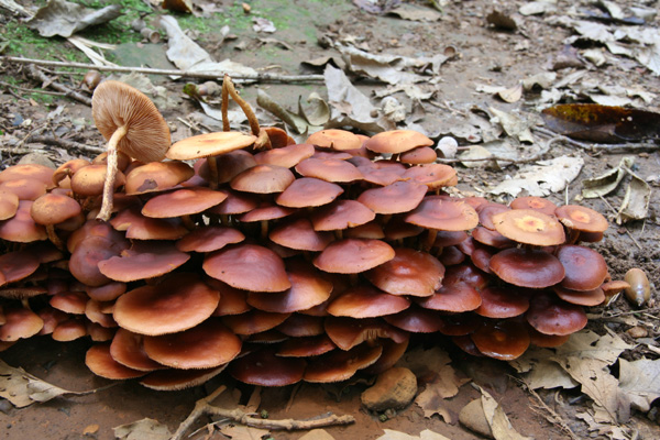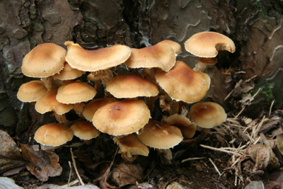 | 切り株や、地表面を走る根から多数群生する小型から中型のキノコ | |